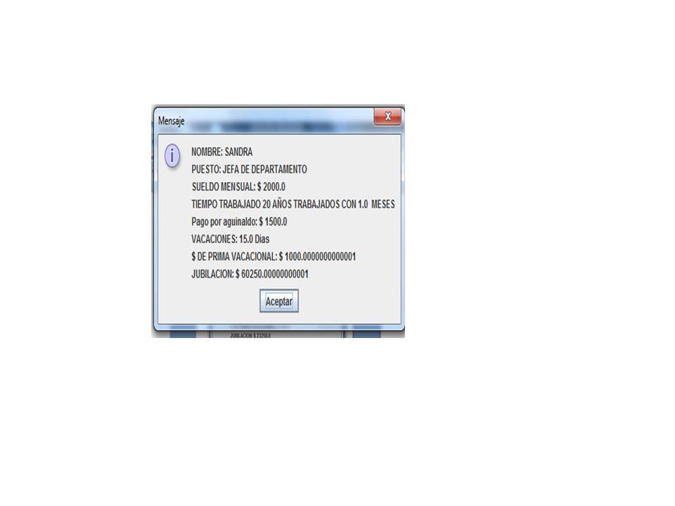 for(j = 0; j<3 nom =" JOptionPane.showInputDialog(" puest =" JOptionPane.showInputDialog(" suel_men =" Double.parseDouble(JOptionPane.showInputDialog(" mes_ing =" Integer.parseInt(JOptionPane.showInputDialog(" o_ing =" Integer.parseInt(JOptionPane.showInputDialog(" mes_egr =" Integer.parseInt(JOptionPane.showInputDialog(" o_egr =" Integer.parseInt(JOptionPane.showInputDialog(" aguinaldo =" emp[j].anual();" finiquito =" emp[j].JUBILACION();" primavacacional =" emp[j].primav();" f_total =" f_total" j =" 0;" imprimir_todo =" emp[j].agui()" imprimir_todo =" emp[j].DATOS_EMPLEADO()+" o="="0)" vacaciones =" 5;" primavac =" pagodiario">= 1 && año <=2) { vacaciones = 5; primavac = pagodiario * 5; } else if(año >= 3 && año <=5) { vacaciones = 10; primavac = pagodiario * (10); } else if(año >= 5)